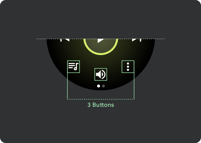 Auf Wear OS-Geräten mit größeren Bildschirmen wird der zusätzliche Platz für die Symbole im mittleren Bereich und im Bereich der Fußzeile genutzt, um die Größe der Tippziele zu erhöhen. Das bedeutet, dass neben einem festen Steuerelementatom die Eigenschaften „Verfügbaren Platz ausfüllen“ auf Symbolcontainer angewendet werden: