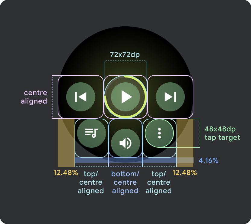 Il controllo principale (Riproduci/Metti in pausa) passa da 60 dp a 72 dp sui dispositivi Wear OS più grandi di 225 dp, rendendo la sezione centrale alta 72 dp e aumentando di conseguenza i target di tocco per tutti i controlli al suo interno. Si tratta di un comportamento adattabile integrato che erediterai dal modello Media Player.