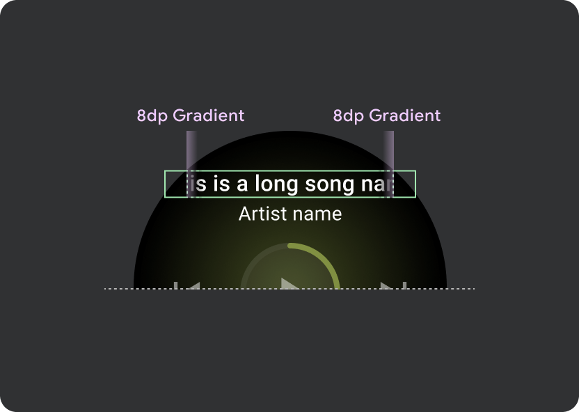 All'interno dell'intestazione, utilizza un margine universale del 9,38%, con un margine aggiuntivo del 6,3% per il titolo del brano. Utilizza un gradiente di 8 dp per i titoli scorrevoli e un'ulteriore spaziatura di 8 dp (con gradiente di 8 dp) quando è presente un'icona. Includi eventuali transizioni di scorrimento del carosello sotto l'icona, la cui posizione rimane fissa.