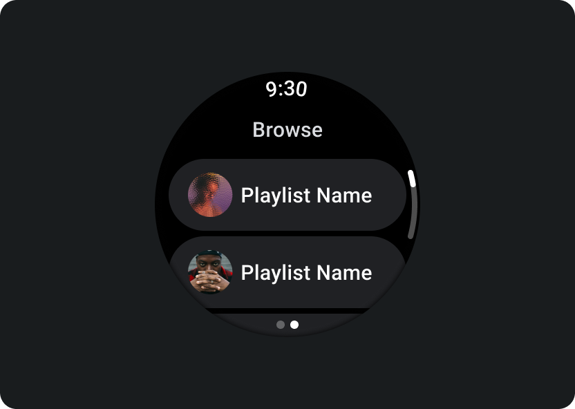 アプリ階層を削減して、ユーザーにメディアを公開します。フラットな情報アーキテクチャを使って、ユーザーがすばやくリストにアクセスしてサムネイルを表示できるようにします。Wear OS にはカスタム デザイン コンポーネントの使用を検討してください。詳しくは、チップとカードについてのデザイン推奨事項をご覧ください。