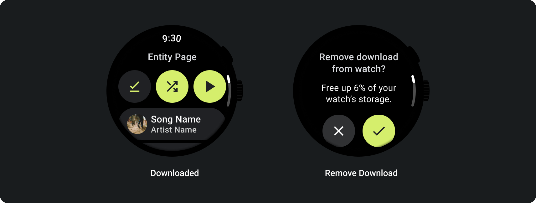 コンテンツがダウンロード済みの場合は、スマートウォッチからダウンロードを削除するアクションを表示することでダウンロード済みの状況を明確にします。この場合は、次の画像に示すように、そのダウンロードがスマートウォッチで占有しているサイズも示す必要があります。