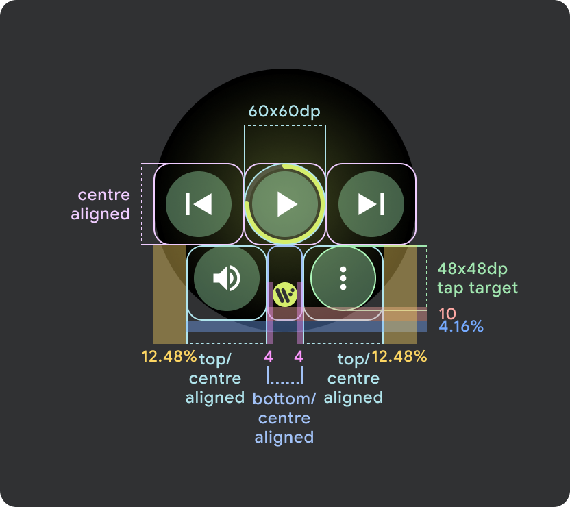 225 dp より大きい Wear OS デバイスでは、メイン コントロール(再生/一時停止)が 60 dp から 72 dp に拡大され、中央のセクションの高さが 72 dp になるため、その中のすべてのコントロールのタップ ターゲットが拡大されます。これは、メディア プレーヤー テンプレートから継承するレスポンシブな動作です。