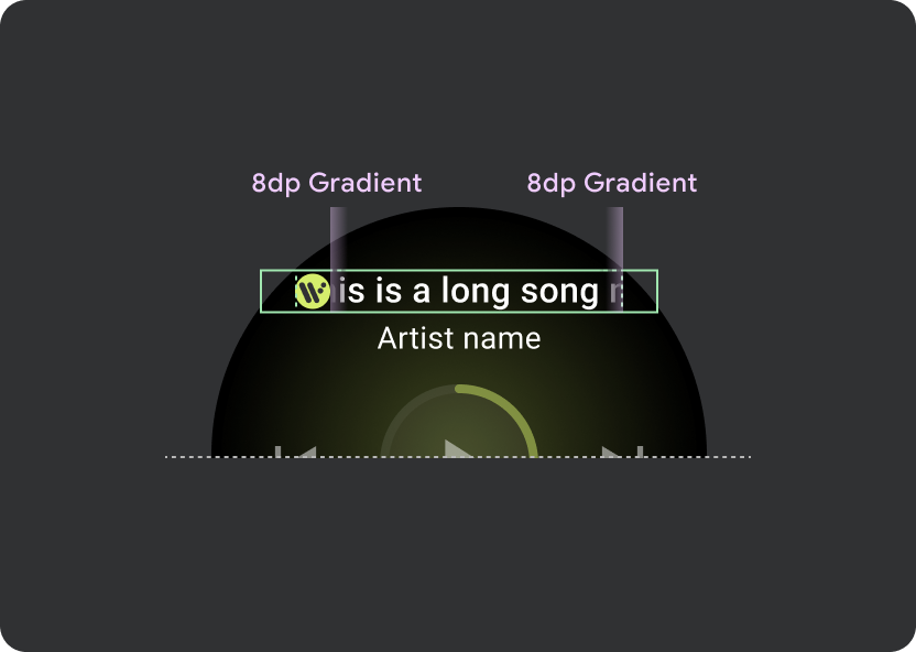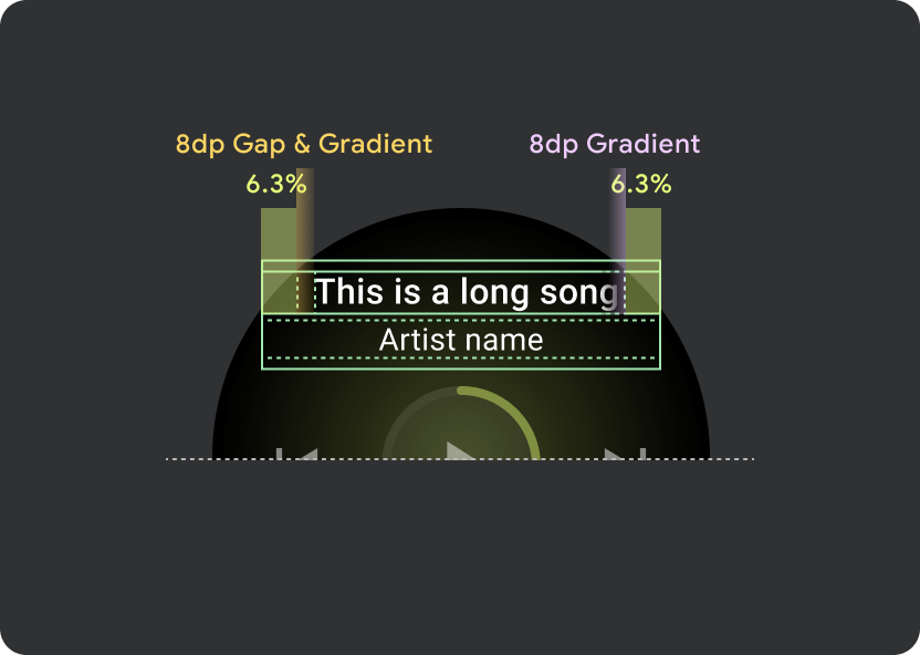 ヘッダー内では、9.38% のユニバーサル マージンを使用し、曲のタイトルには 6.3% の追加マージンを使用します。スクロールするタイトルには 8 dp のグラデーションを使用します。アイコンがある場合は、さらに 8 dp のギャップ(8 dp のグラデーションあり)を使用します。アイコンの下に、位置が固定されたマーキー スクロール アニメーションを含めます。