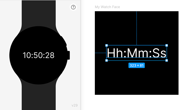 वॉच फ़ेस डिज़ाइनर विंडो में, टेक्स्ट के व्यवहार को "स्टैटिक" से "डिजिटल समय" में बदलें. झलक में दिखाया गया है कि यह किसी असली डिवाइस पर कैसा दिखेगा: