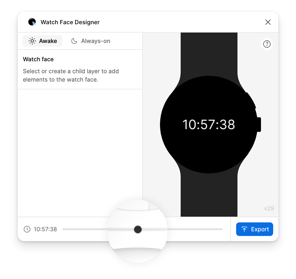 프레임을 만들고 구성한 후 시계 화면 디자이너 플러그인을 열고 방금 만든 프레임을 선택합니다. 워치 페이스 디자이너 창에 실시간 미리보기가 표시됩니다.