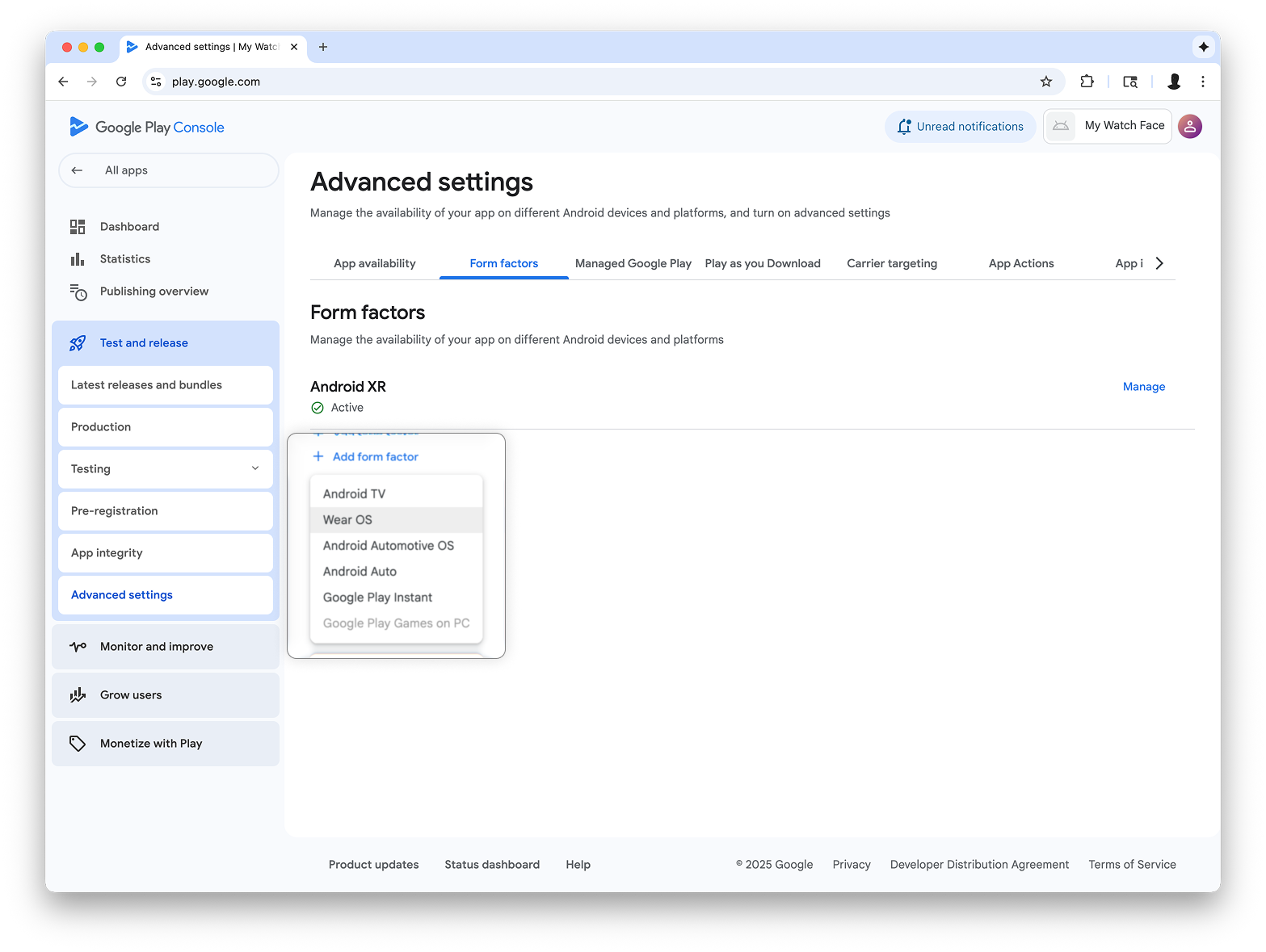 पेज के सबसे ऊपर दाईं ओर मौजूद ड्रॉप-डाउन मेन्यू में जाकर, डिवाइस के साइज़, डाइमेंशन या कॉन्फ़िगरेशन मैनेज करें को चुनें. इसके बाद, अपने ऐप्लिकेशन के लिए Wear OS को डिवाइस के साइज़, डाइमेंशन या कॉन्फ़िगरेशन के तौर पर जोड़ें:
