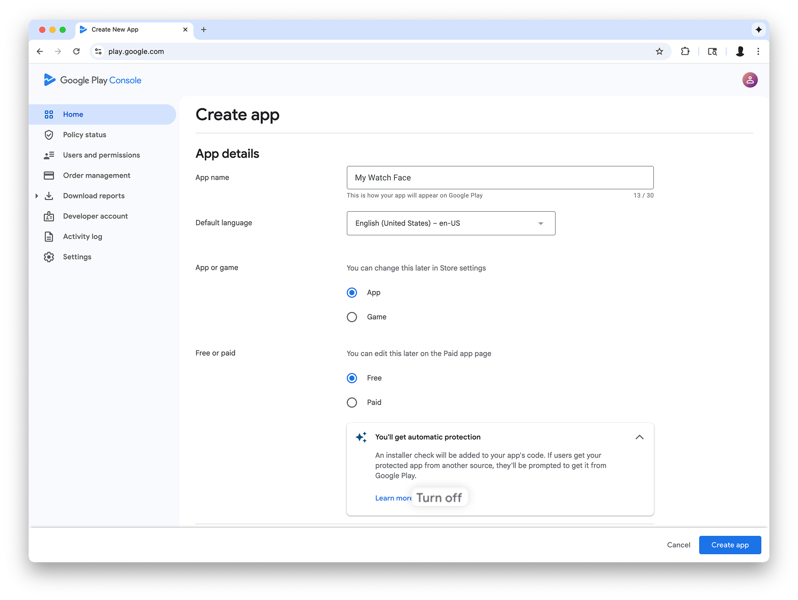 "ऐप्लिकेशन बनाएं" वर्कफ़्लो के दौरान, प्रॉम्प्ट मिलने पर ऑटोमैटिक प्रोटेक्शन की सुविधा बंद करें. ऐसा न करने पर, बाद में बंडल पर हस्ताक्षर करने में समस्याएं आएंगी. ऑटोमैटिक प्रोटेक्शन की सुविधा, वॉच फ़ेस के लिए काम नहीं करती. ऐसा इसलिए है, क्योंकि उनमें कोई कोड नहीं होता.