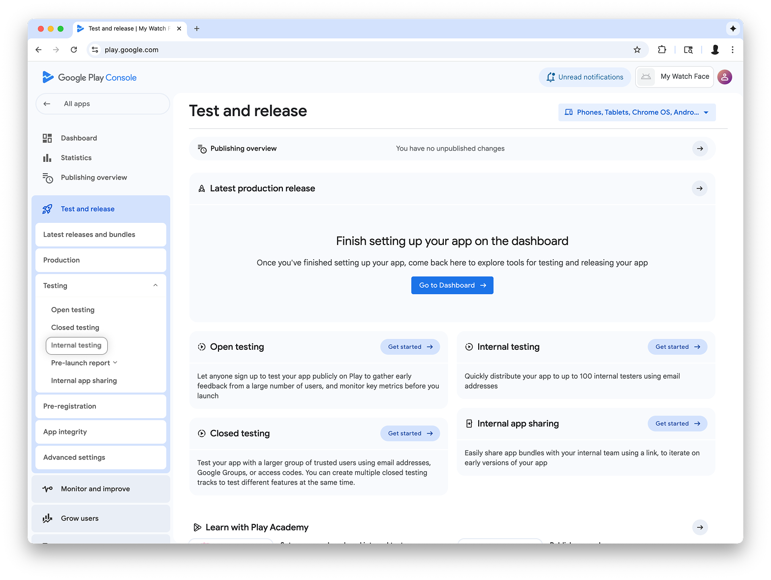 इंटरनल टेस्टिंग मेन्यू पर वापस जाएं और सिर्फ़ Wear OS के लिए इंटरनल टेस्टिंग ट्रैक बनाएं. इसके बाद, रिलीज़ बनाएं: