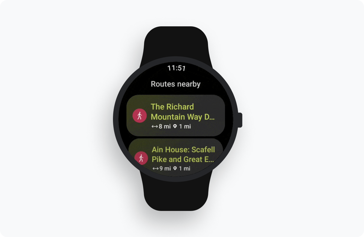 استخدِم المنصات التي تعمل بنظام التشغيل Wear OS لإلقاء نظرة سريعة، مثل الشاشات والإضافات، حتى يتمكّن المستخدمون من الاطّلاع على المقاييس بسرعة من أي تمرين.