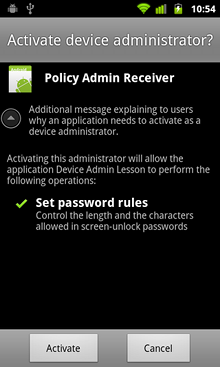 if (!policy.isAdminActive()) { Intent activateDeviceAdminIntent = new Intent(DevicePolicyManager.ACTION_ADD_DEVICE_ADMIN); activateDeviceAdminIntent.putExtra( DevicePolicyManager.EXTRA_DEVICE_ADMIN, policy.getPolicyAdmin()); // It is good practice to include the optional explanation text to // explain to user why the application is requesting to be a device // administrator. The system will display this message on the activation // screen. activateDeviceAdminIntent.putExtra( DevicePolicyManager.EXTRA_ADD_EXPLANATION, getResources().getString(R.string.device_admin_activation_message)); startActivityForResult(activateDeviceAdminIntent, REQ_ACTIVATE_DEVICE_ADMIN); }